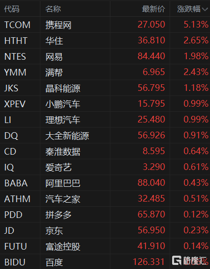 格隆汇9月20日丨中概股逆市走高,纳斯达克中国金龙指数涨0.33%,报6934.69点。携程网涨超5%,华住、满帮涨超2%,网易、晶科能源涨超1%,小鹏汽车、理想汽车、大全新能源涨近1%,爱奇艺、阿里巴巴、拼多多、京东等跟涨。