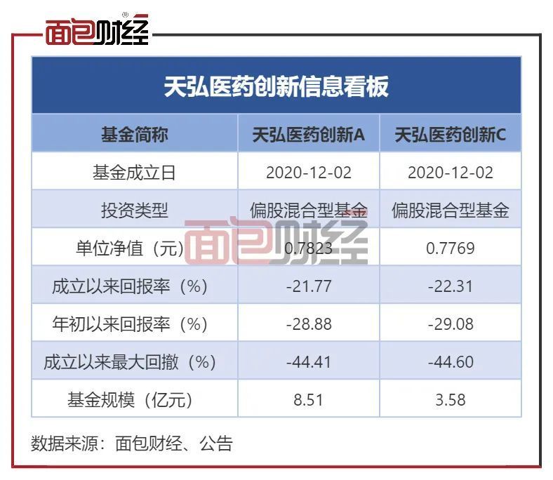 仅看年内表现时,天弘医药创新A、C类份额的单位净值年内回撤超28%,跑输业绩基准逾5个百分点,在2669只偏股混合型产品中名列2400位以外,整体业绩靠后。