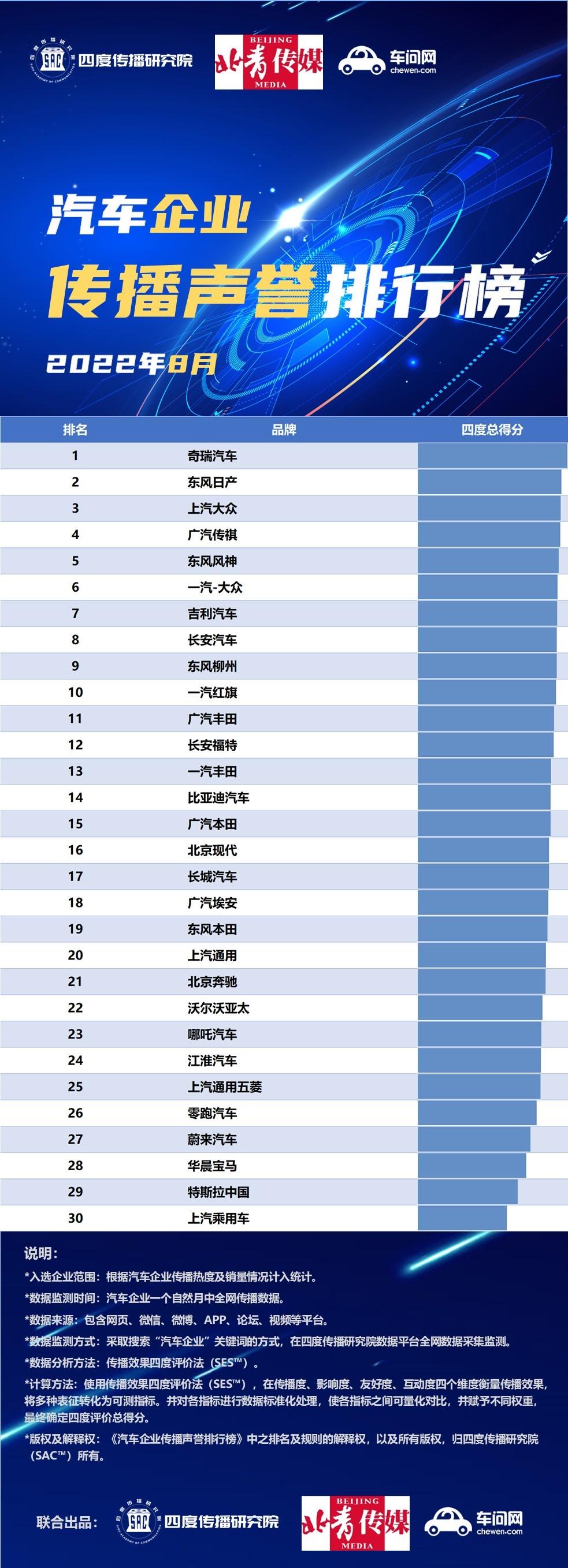9月21日,四度传播研究院(SAC)联合北青传媒、车问网,正式发布了2022年8月份共30家汽车企业和50款汽车品牌的传播声誉排行榜。与7月不同,8月份汽车品牌的总声量要超过汽车厂商的总声量,这跟8月举办的成都国际车展有很大关系,各大车企公关部显然都把子弹放在了各自的品牌宣传上。
